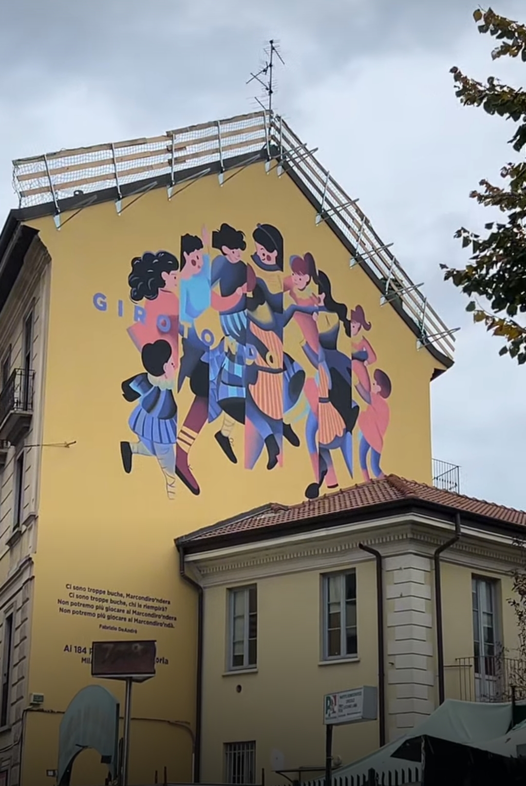 Risulta essere un inno alla pace ed evoca un mondo sconvolto dalla guerra dove per i bambini non c’è spazio per giocare, come ricordano le parole della canzone “Girotondo” di Fabrizio De André che accompagnano il murale: