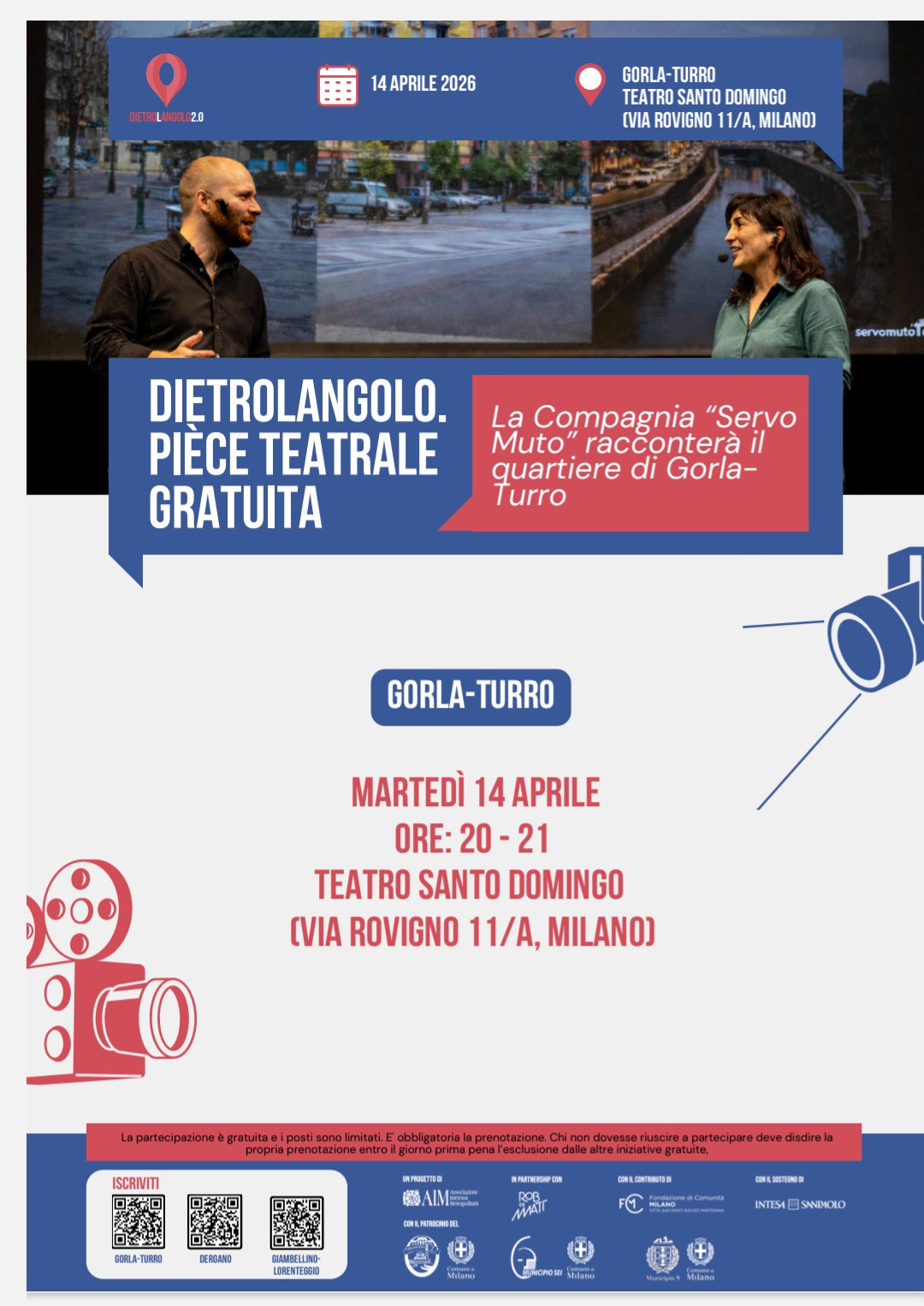 La pièce dedicata a Gorla-Turro, realizzata con la compagnia ServoMuto, accompagna il pubblico in un attraversamento emotivo e urbano tra le rive della Martesana, le ville storiche, gli spazi di incontro e i segni profondi lasciati dal tempo. Un percorso che intreccia la dimensione più viva e quotidiana del quartiere con la sua memoria più intensa, a partire anche dal ricordo dei Piccoli Martiri di Gorla, che qui continua a parlare alla città.
