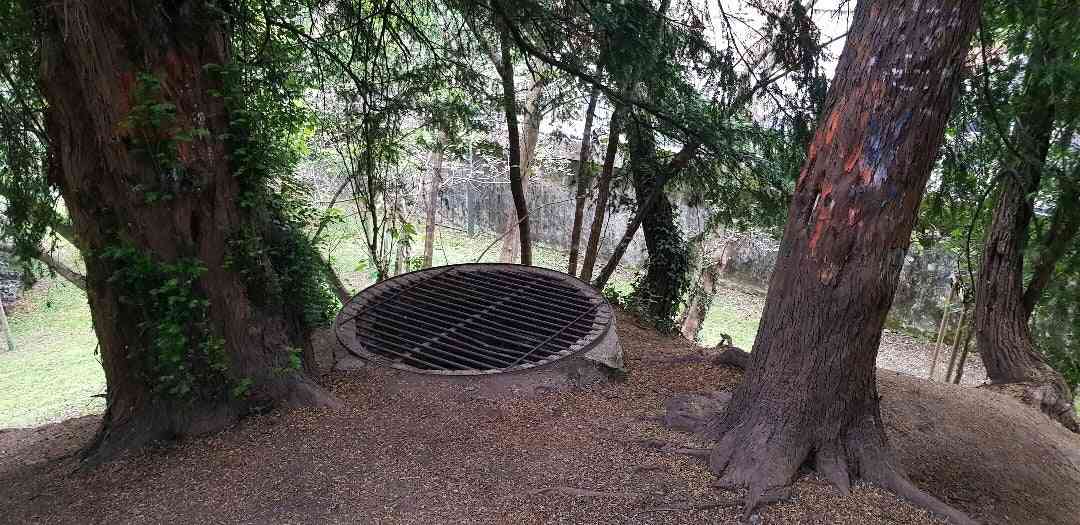 La struttura ha tre entrate, collegate a tre corridoi a volta, collegate tra loro che conducono alla camera centrale. L'entrata principale (a nella mappa) è murata, l'ingresso b risulta coperto da terra e vegetazione e dall'esterno non è identificabile ed è stato quello utilizzato dagli speleologi per entrare.